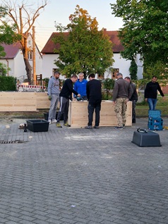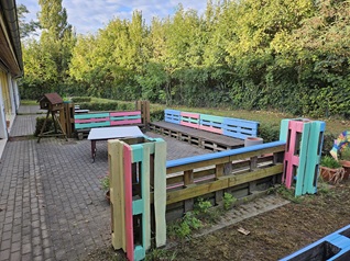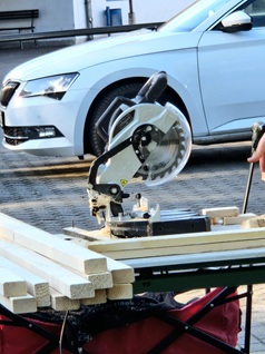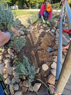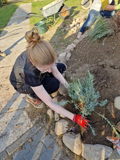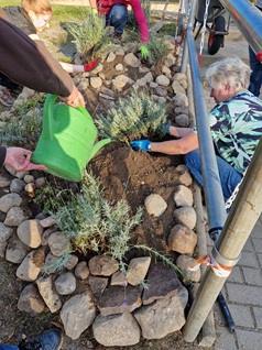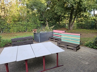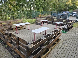 auf dem Schulgelände. So wurden Hochbeete gebaut, Terrassenmöbel geschliffen und gestrichen, eine Blühwiese angelegt,