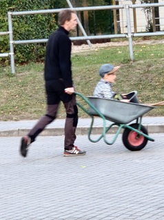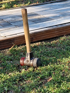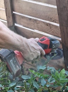 Schippen, große Pinsel, Akkuschrauber, Schubkarren