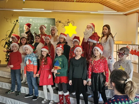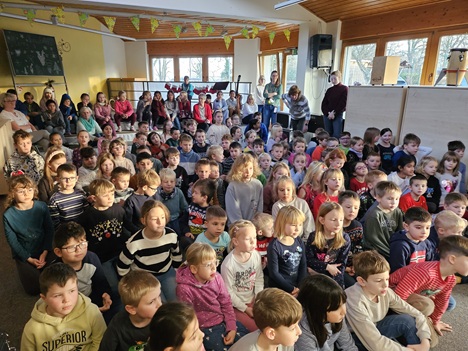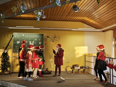Nach dem die 1. Klassen heute ihr wöchentliches Weihnachtslied präsentierten, polterte es plötzlich im Schulhaus und der